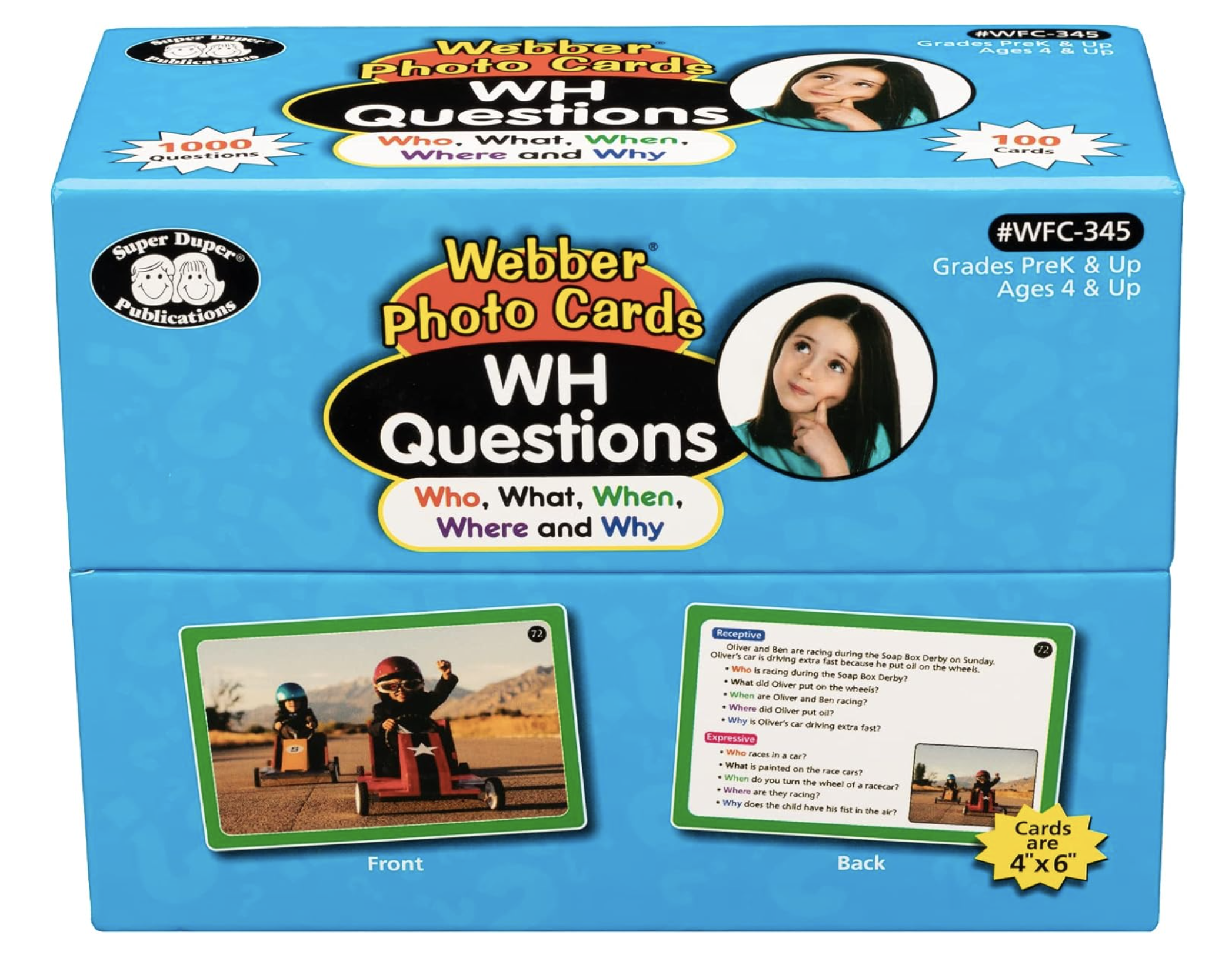 Wh-questions are common challenges for children with language difficulties. Understanding the questions and answering them can be difficult, and these photo cards with question prompts can provide parents with opportunities to follow up on wh-question practice at home with their little ones. Each picture comes with corresponding questions on the back, so parents don’t have to come up with these themselves. Also, these cards can easily be paired with any motivating game of your child’s choice, to keep things interesting.
